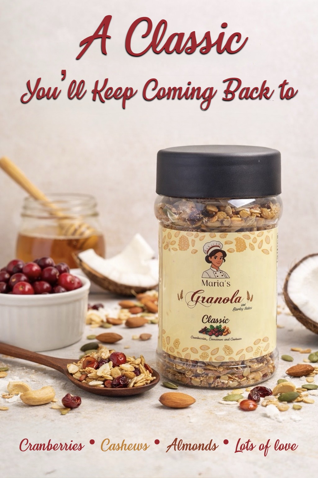 Barley Flakes, Coconut Flakes, Almonds, Cashews, Honey, Cocunut Oil, Char Magaz, Pumpkin Seeds, Cranberries